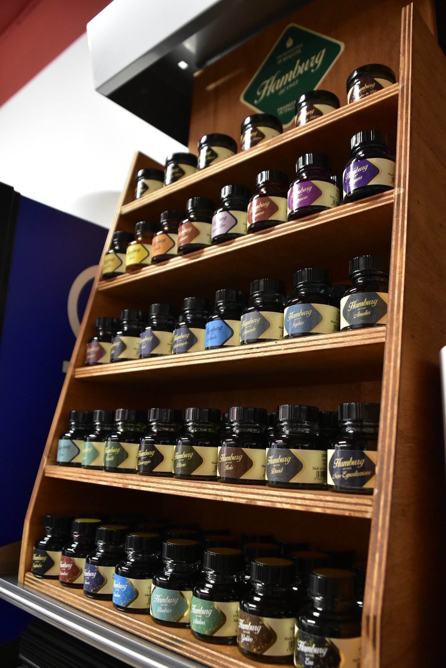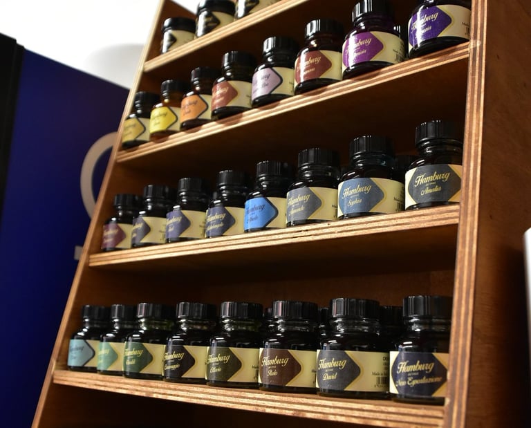 Selezione professionale di 32 inchiostri a base acqua Hamburg, tra cui anche quelli dorati, usati tradizionalmente nelle riproduzioni calligrafiche o in abbinamento agli acquerelli. Offriamo anche inchiostri tradizionali in polvere nella varietà Mogano ed Ebano.