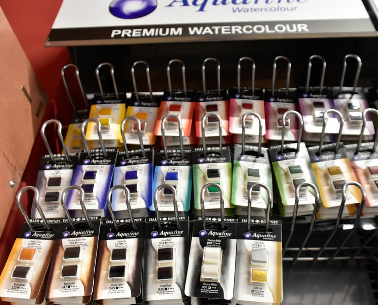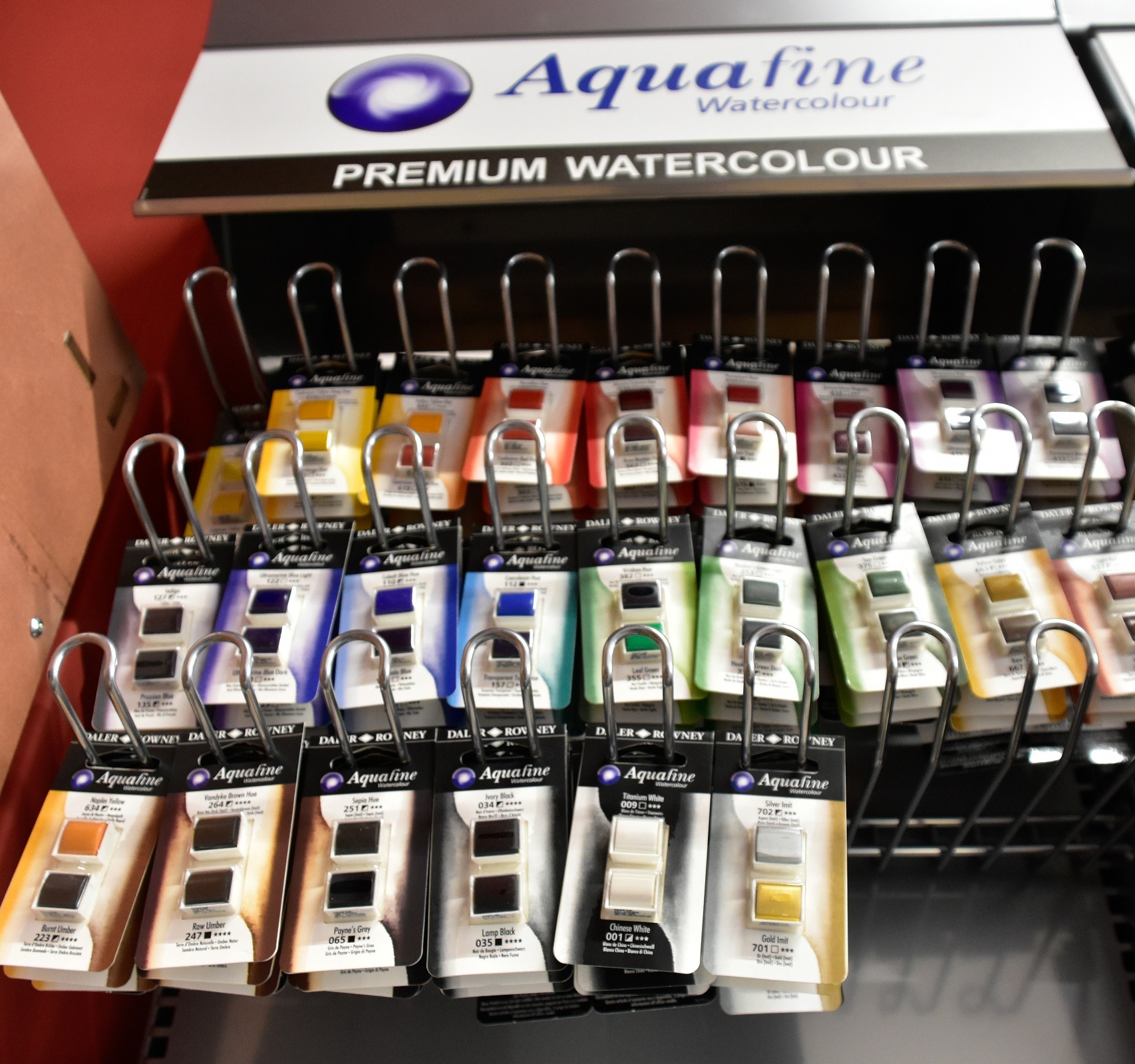 Aquafine professional line by Daler-Rowney both in semi-godett format and in tubes, together with inks, available in practical sets.